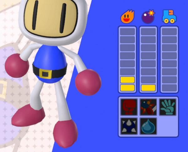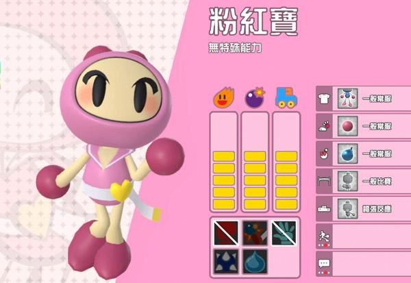 一二每個角色初始能力不同,例如:白寶初始(黃底)只有1顆炸彈、2個威力、0跑速,但透過收集後(灰底),能力值會是最高的,除此之外,還可以擁有踢、丟、揍、穿刺炸彈、水滴炸彈的能力。